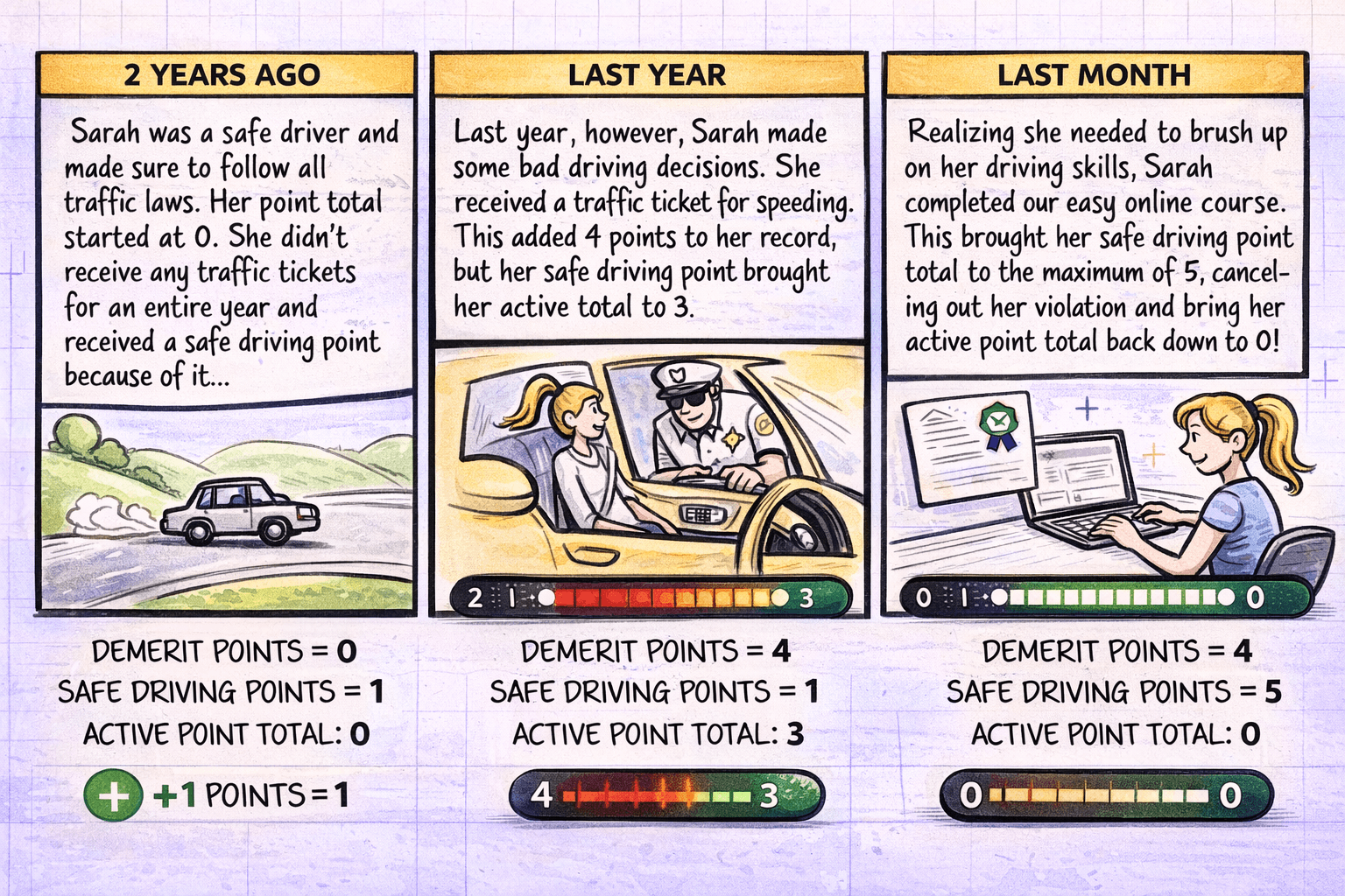This accelerated point earning is particularly valuable when you've recently received violations and need to offset demerit points immediately, when you're approaching suspension thresholds and need quick protection, when you have upcoming situations (long road trips, stressful periods) where violation risk is elevated, or when you simply want to build proactive protection before any violations occur.